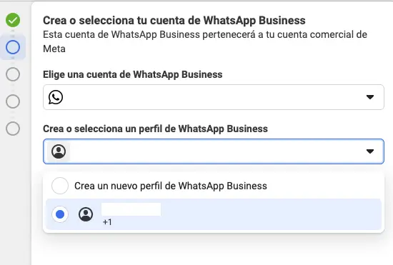 6. Luego en el siguiente formulario se mostrará la opción de seleccionar o crear una cuenta de WhatsApp Business. Elige una cuenta de WhatsApp business y luego crea o selecciona un perfil de WhatsApp Business. Luego presiona “Siguiente”.
