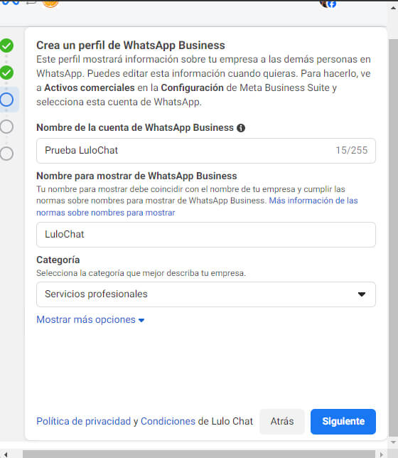 • Nombre para mostrar del perfil de WhatsApp Business. Es recomendable que este nombre haga referencia a la información del negocio ya que el algoritmo de Facebook está en constante consulta y si nota algo extraño es posible que te bloquee la cuenta.